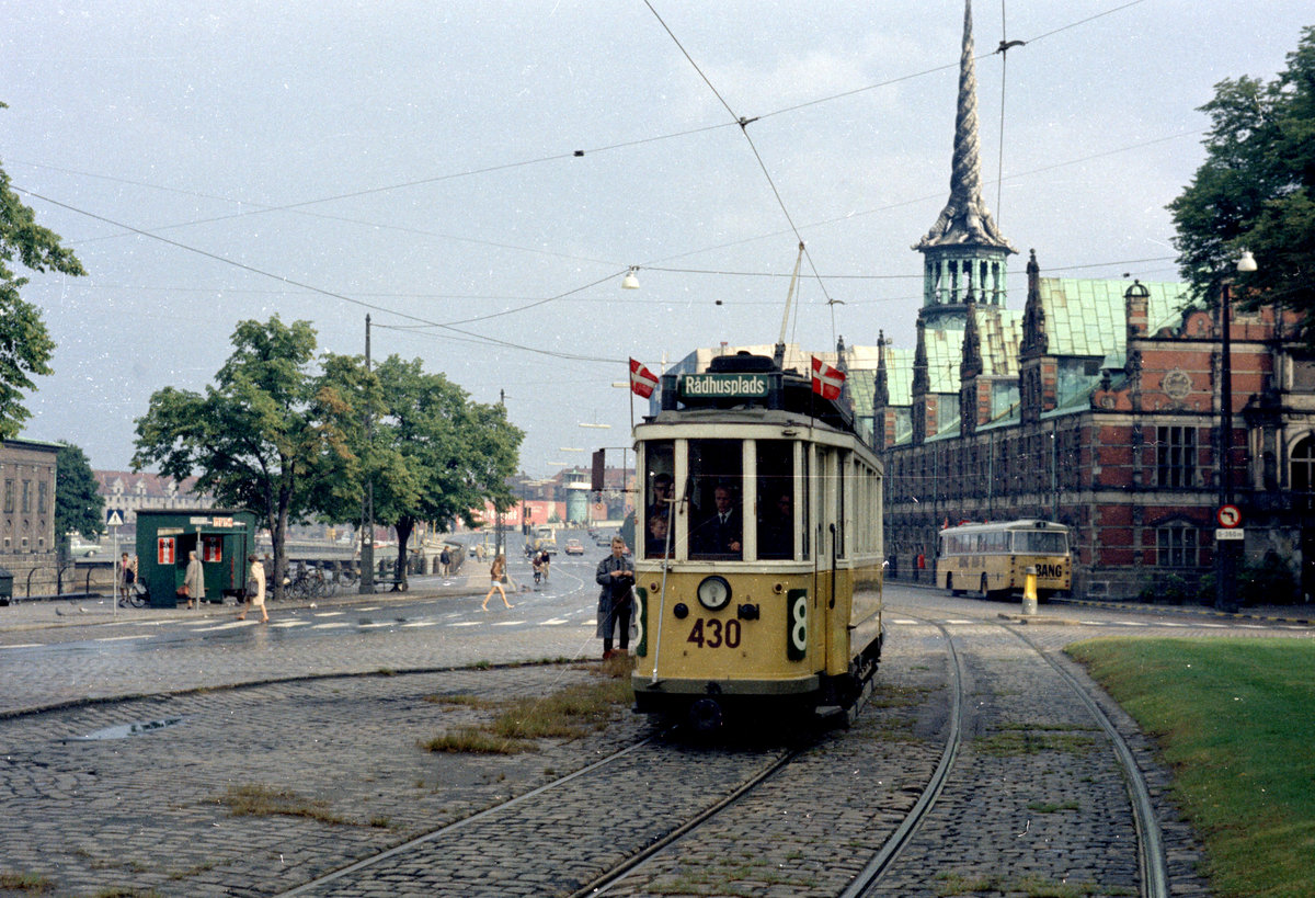 København / Kopenhagen Københavns Sporveje am 17. August 1968: Der KS-Museumstriebwagen 430 hat eben die Haltestelle am Kopenhagener Rathausplatz in Richtung Christianshavn verlassen. Zusammen mit dem Tw 305 bediente der Tw 430 als Sonderstraßenbahnlinie 8 die Strecke Rådhusplads (Studiestræde)-Christianshavn (Skånegade). - Die (richtige) SL 8 (Bellahøj-Rådhusplads-Christianshavn) wurde im Frühling 1965 eingestellt, aber anlässlich des 350jährigen Jubiläums des Stadtteiles Christianshavn, das am Wochenende dem 17. und 18. August 1968 gefeiert wurde, hatte man eine verkürzte Linie 8 an diesem Wochenende wiedererstehen lassen. - Der Tw 430 befindet sich jetzt in der Sammlung des Dänischen Straßenbahnmuseums (Sporvejsmuseet Skjoldenæsholm. - Scan von einem Farbnegativ. Film: Kodak Kodacolor X Film.