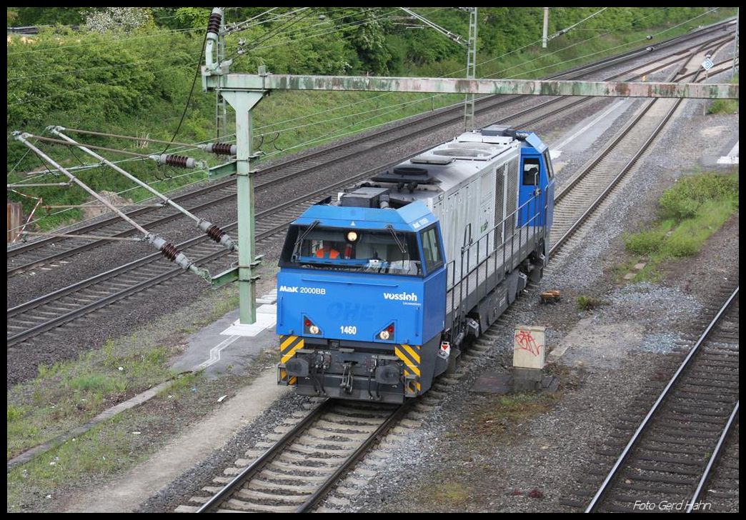 Vossloh 1460 Mak 2000 BB kehrt hier solo am 3.5.2017 um 16.48 Uhr vom Hafen Osnabrück nach Hasbergen zurück. Sie wir hier im Bahnhof Hasbergen  Kopf machen  und dann weiter über das hier sichtbare rechte Gleis der Werkbahn nach Georgsmarienhütte fahren.