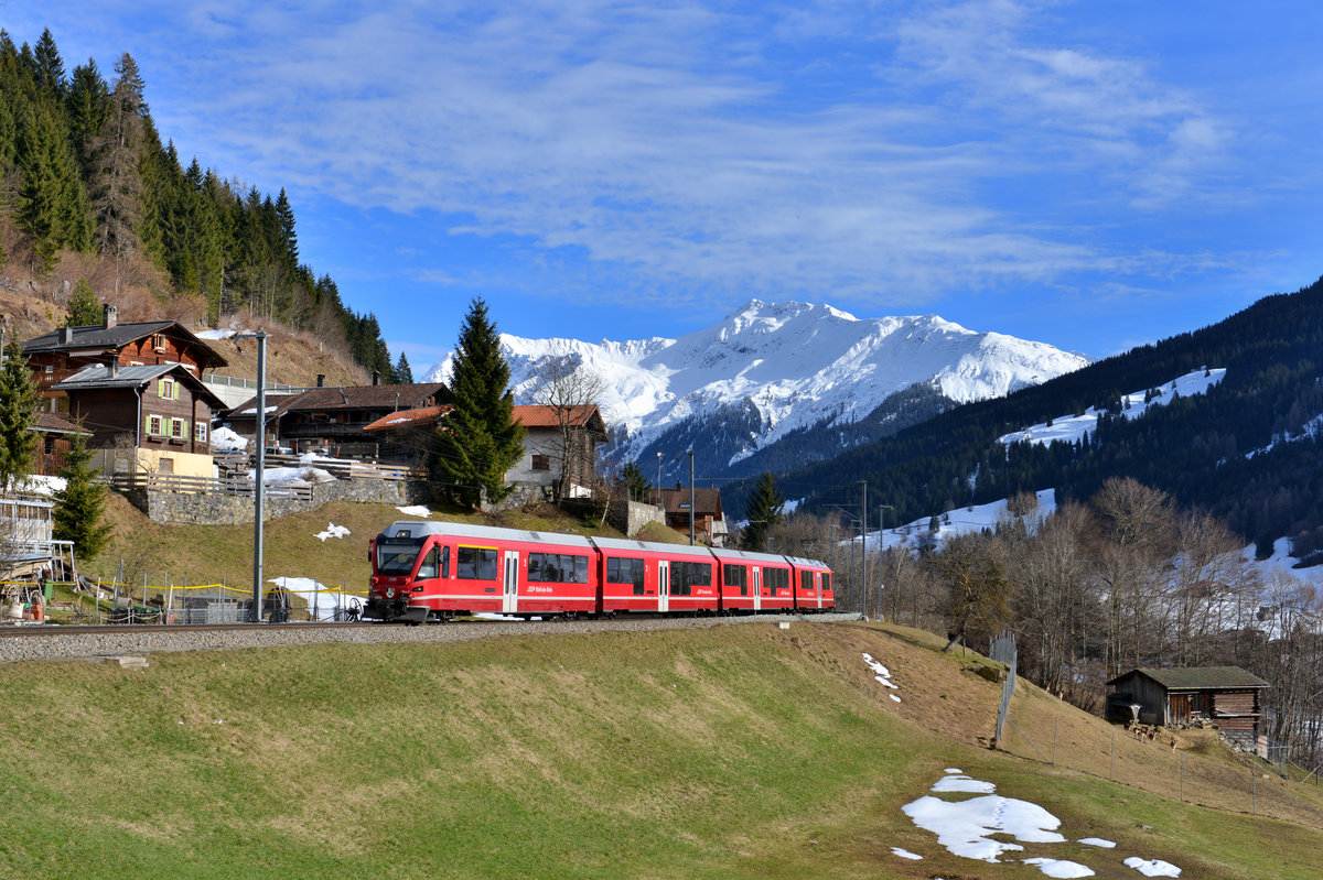 Die Aufnahme der Begegnung zwischen dem BDe 4/4 7 und dem Be 4/8 35 entstand in Speicher am 24. April 2017.