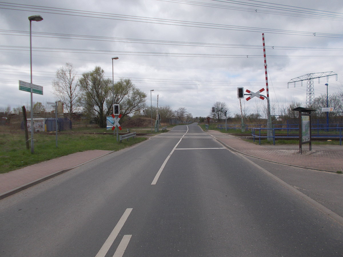 Bahnübergang an der Station Schönelinde(Heidekrautbahn)am 08.April 2017.Rechts die Station.