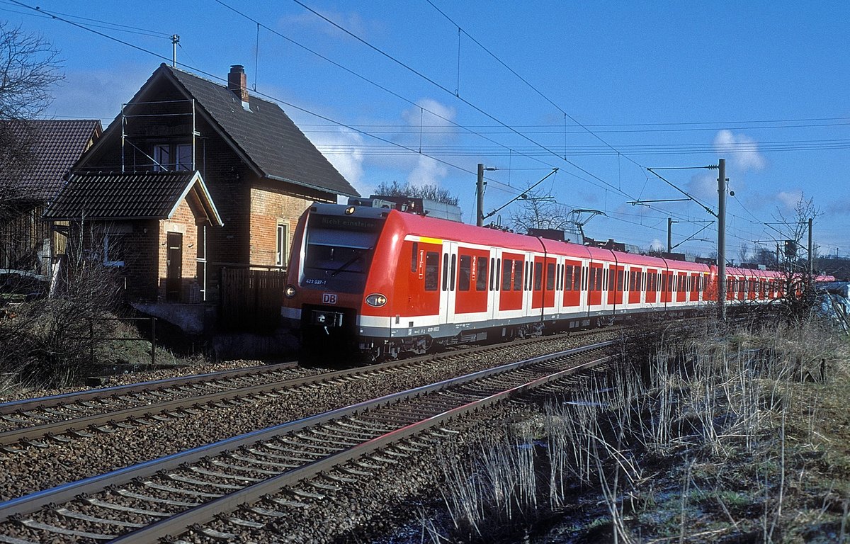 Eine S-Bahn nach Wartenberg erreicht am Morgen des 08.04.17 Hohenschönhausen. Die Werbeeinheit für den Club Adagio hing leider an zweiter Stelle.
