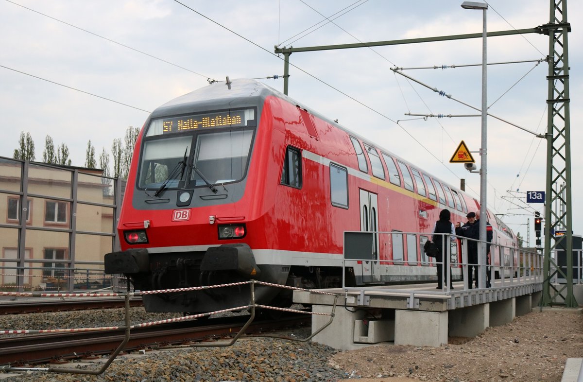 DABpbzfa und ein weiterer Doppelstockwagen mit BR 143 der S-Bahn Mitteldeutschland als S 37760 (S7) nach Halle-Nietleben stehen am Startbahnhof Halle(Saale)Hbf Gl. 13a, fotografiert vom dazugehörigen Treppenzugang an der Delitzscher Straße. Der abgebildete Standort an der Ostumfahrung für den Güterverkehr fungiert als Interimsbahnsteig während des Umbaus des Knotens Halle bis 2019. [1.5.2017 - 19:48 Uhr]