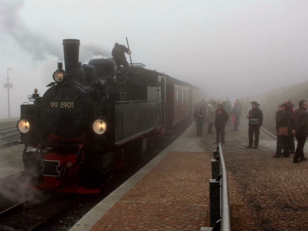 Am 04. November 2017 steht 99 5901 mit Ihrem Sonderzug im Bahnhof Brocken bei typischen Brockenwetter.