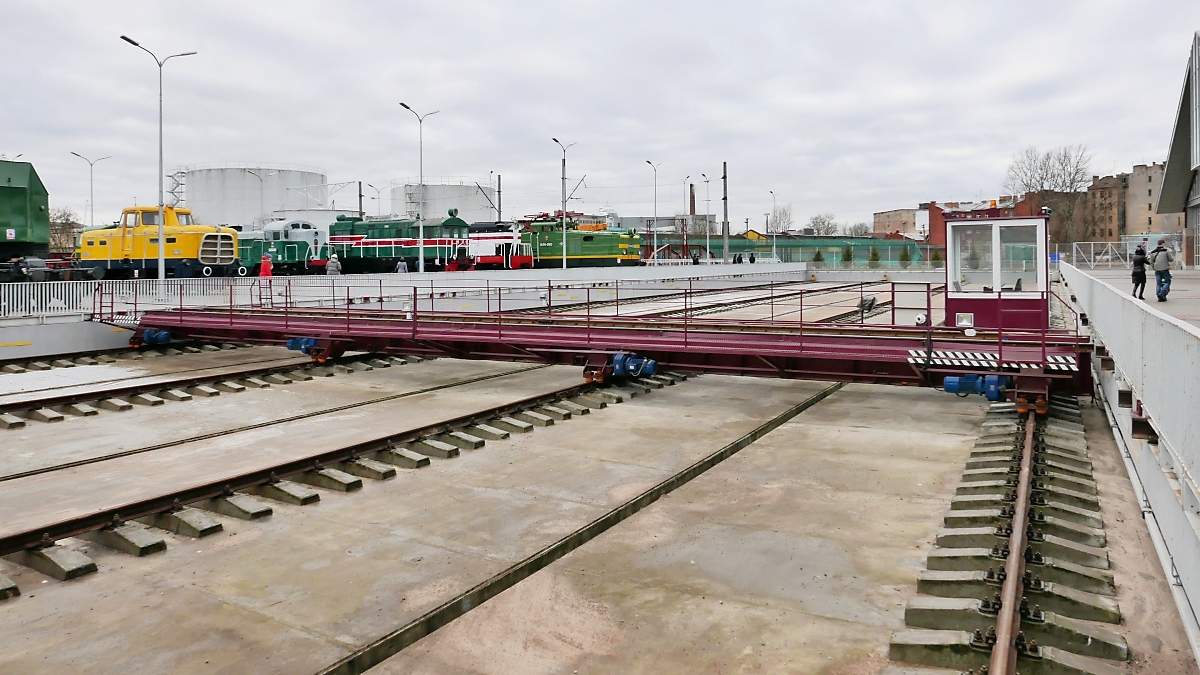 Die Schiebebühne zur Verteilung der Fahrzeuge auf dem Freigelände und in die neue Museumshalle, im Russischen Eisenbahnmuseum in St. Petersburg, 4.11.2017