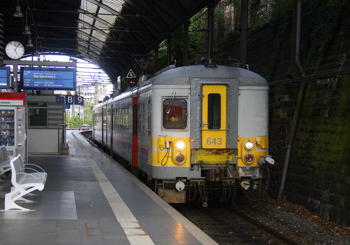 Ein Triebzug der SNCB 643 kommt aus  Spa-Géronstère(B) nach Aachen-Hbf(D) und kommt aus Richtung Welkenraedt(B),Lontzen(B),Astenet(B),Hergenrath(B),Aachen-Süd(D) und fährt in den Aachener-Hbf ein.