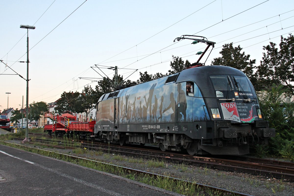 In den ersten Sonnenstrahlen des 27.08.2016 rangierte MNRCE/DB Fernverkehr ES 64 U2-009 (182 509-0)  EUROPA HATÁROK NÉLKÜL 25éve  im Badischen Bahnhof von Basel in Richtung Abstellgleis, nachdem sie die Liege- und Schlafwagen vom ARZ 1499 (Hamburg Altona - Lörrach Gbf) ins Werk zur Wartung und Reinigung brachte.