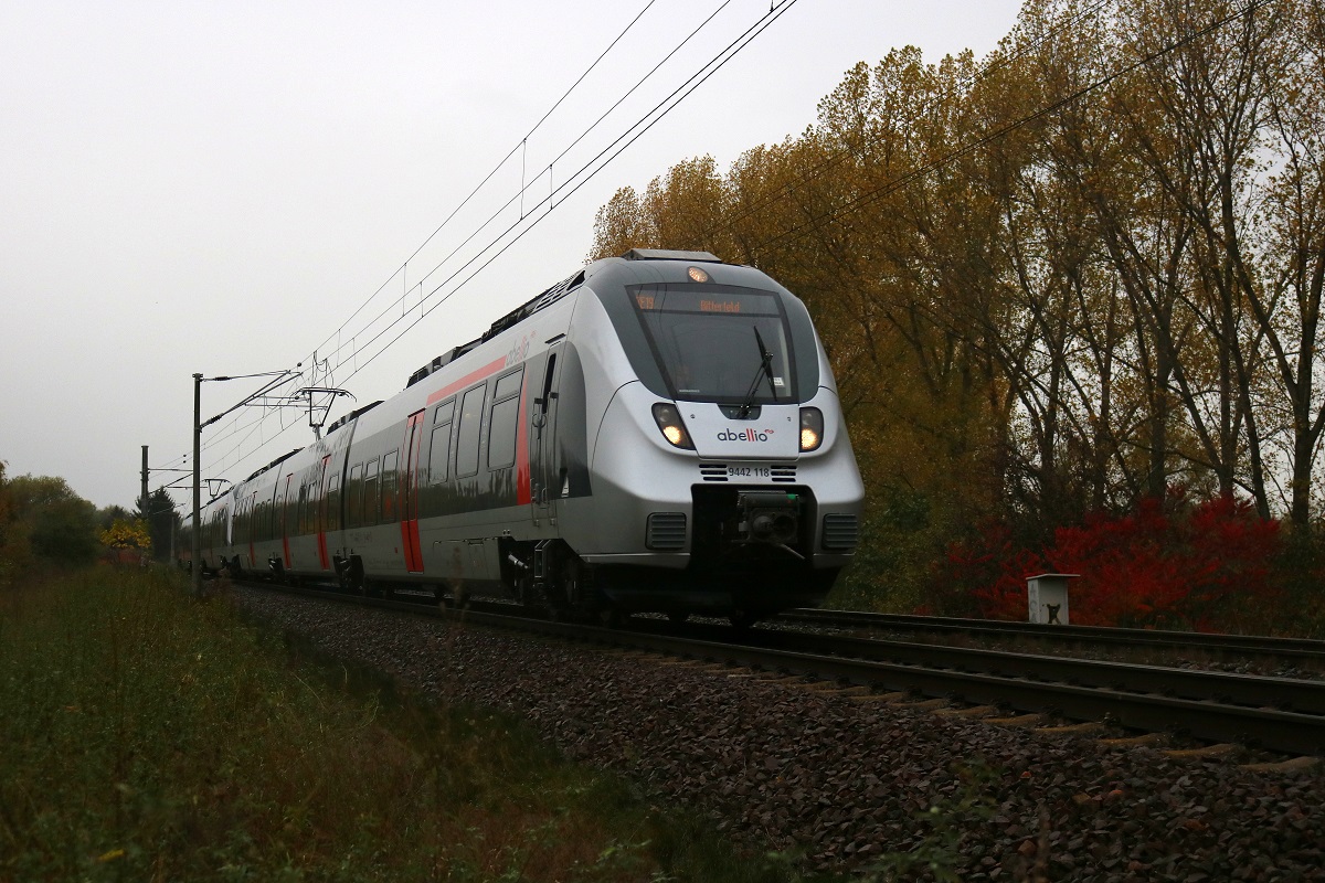 9442 118 und ein weiterer 9442 (Bombardier Talent 2) von Abellio Rail Mitteldeutschland als RB 74731 (RE19) von Leinefelde nach Bitterfeld fahren in Zscherben, Gartenweg, auf der Bahnstrecke Halle–Hann. Münden (KBS 590). [21.10.2017 | 15:56 Uhr]