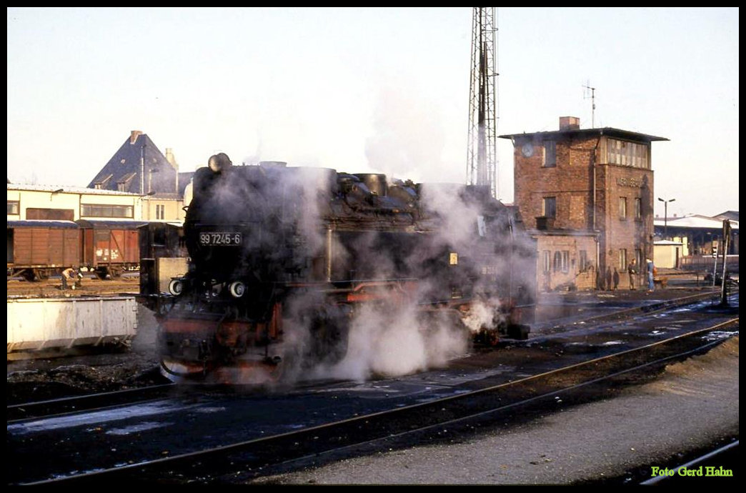 997246 fährt am 10.12.1991 um 10.41 Uhr mit dem P 14432 aus Schierke in Wernigerode ein. Im Hintergrund ist noch das inzwischen abgerissene ehemalige Stellwerk zu sehen.