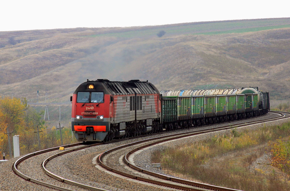 Тепловоз 2ТЭ25КМ-0019 с поездом на участке Юровский - Красная Стрела, Северо-Кавказская Железная Дорога.