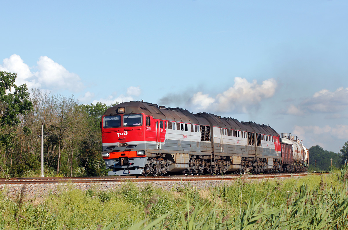 Diesel locomotive 3TE116U-002 with a train on the Yurovsky - Krasnaya Strela section, the North Caucasian Railway.
