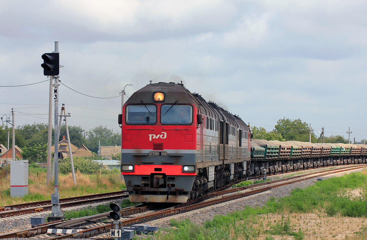 Diesel locomotive 3TE116U-009 with freight train at the station Krasnaya Strela, North-Caucasian Railway.
