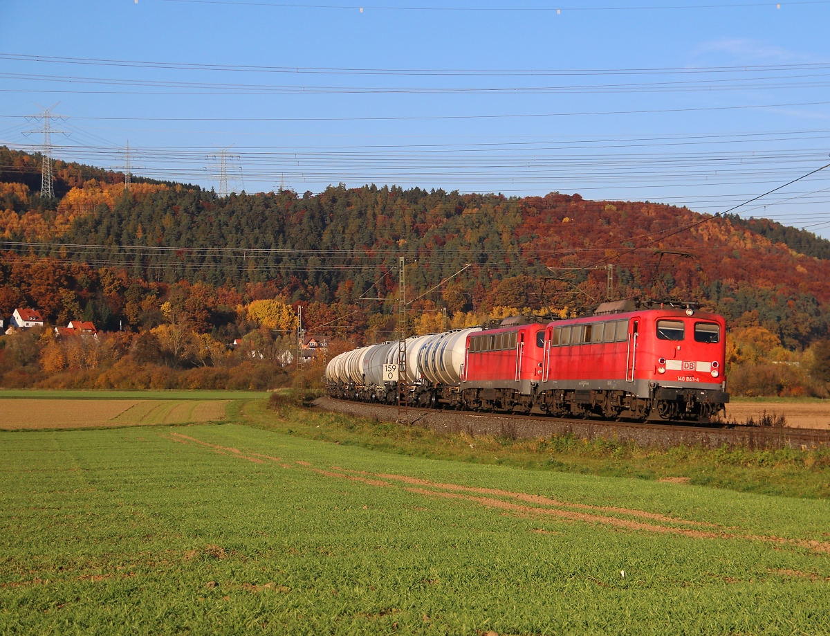 140 843-4 in Doppeltraktion mit 140 858-2 und Kesselwagenzug in Fahrtrichtung Süden. Aufgenommen zwischen Mecklar und Ludwigsau-Friedlos am 01.11.2015.