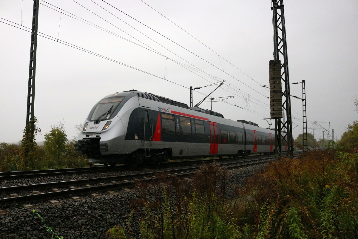 9442 113 (Bombardier Talent 2) von Abellio Rail Mitteldeutschland als RB 74778 (RB75) von Eilenburg nach Lutherstadt Eisleben fährt bei Dauerregen in Angersdorf (Saaleaue) auf der Bahnstrecke Halle–Hann. Münden (KBS 590). [21.10.2017 | 16:48 Uhr]