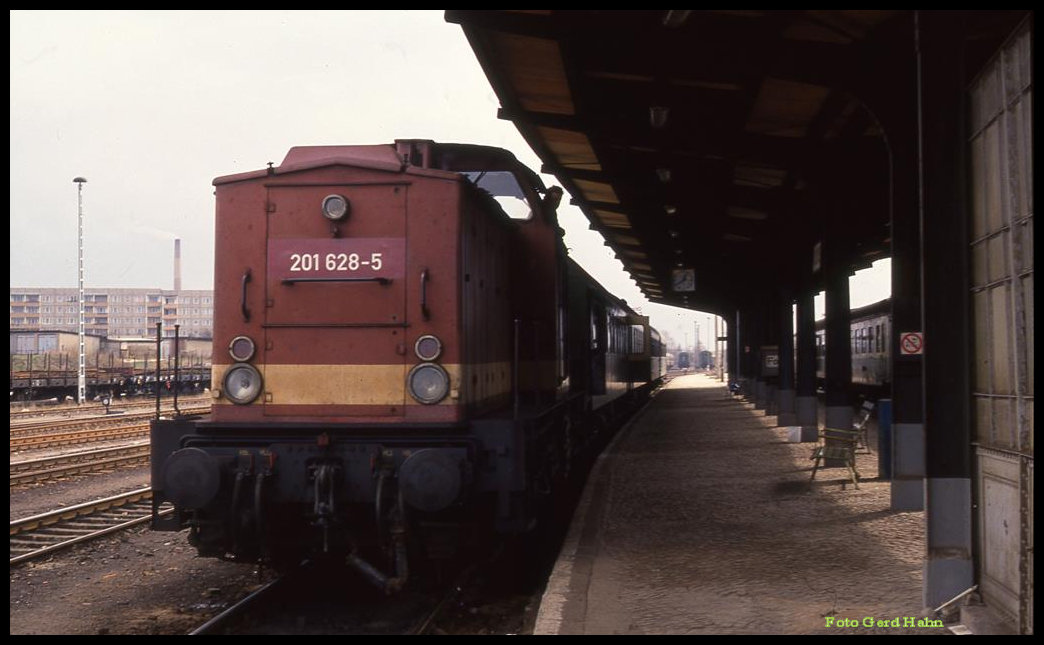 201628 wartet hier am 21.3.1992 um 12.43 Uhr vor dem 8412 nach Quedlinburg im Bahnhof Aschersleben auf die Abfahrt.