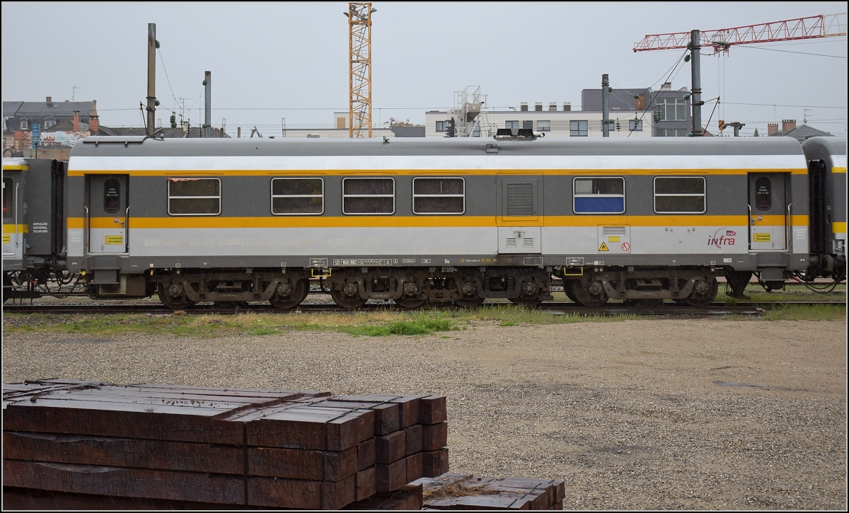 Bahn im Elsass. Dieser spannende vielfüssige Dienstwagen war in Colmar abgestellt. April 2017.