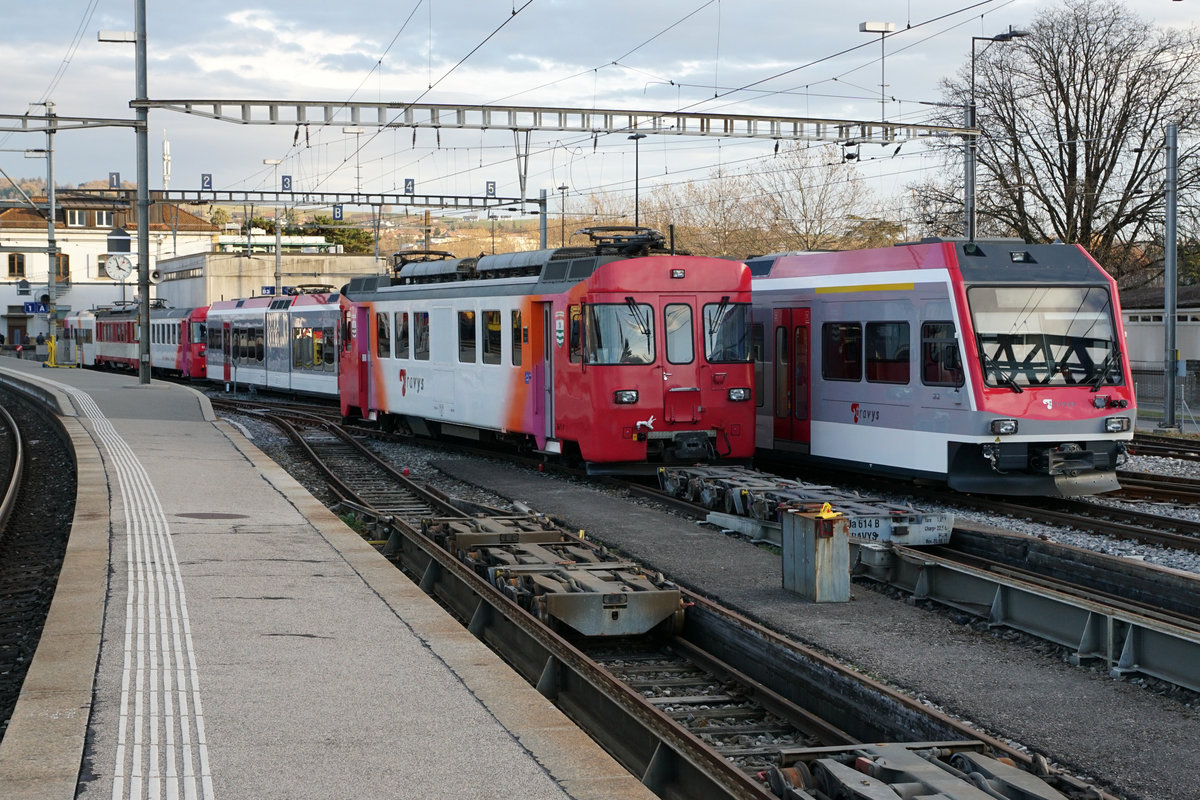 Reservependelzug in verschiedenen Farben der Chemin de fer Yverdon–Ste-Croix.