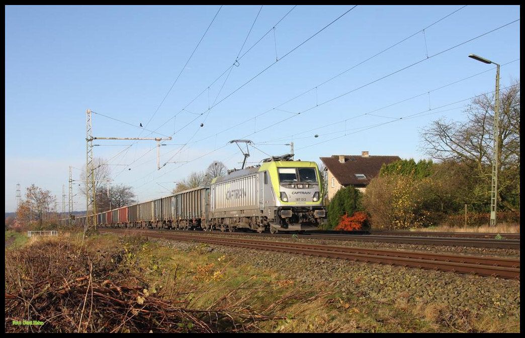 Die neue Captrain Lok 187013 kam am 25.11.2017 um 12.01 Uhr mit einem Ganzzug in Richtung Löhne durch Wissingen.