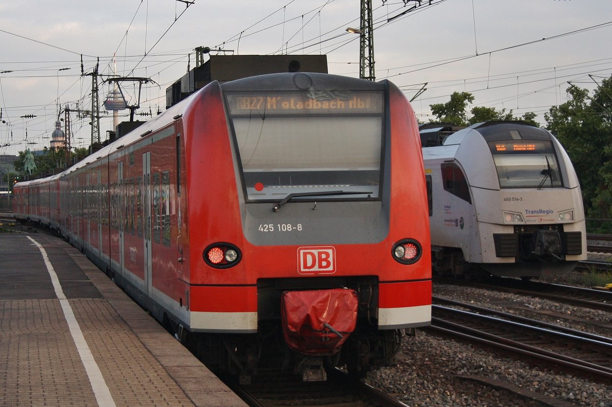 425 108-8 trifft am 4.7.2017 als RB27 (RB12502) "Rhein-Erft-Bahn" von Koblenz Hauptbahnhof nach Mönchengladbach Hauptbahnhof in Köln Messe/Deutz auf 460 514-3 als RB26 (RB25413) nach Mainz Hauptbahnhof.