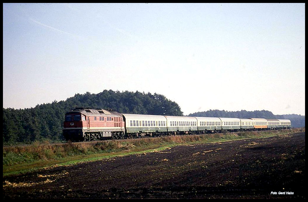 DR 132414 ist hier am 5.10.1991 um 9.34 Uhr bei Jeserig mit einem langen Schnellzug aus Magdeburg kommend in Richtung Berlin unterwegs.