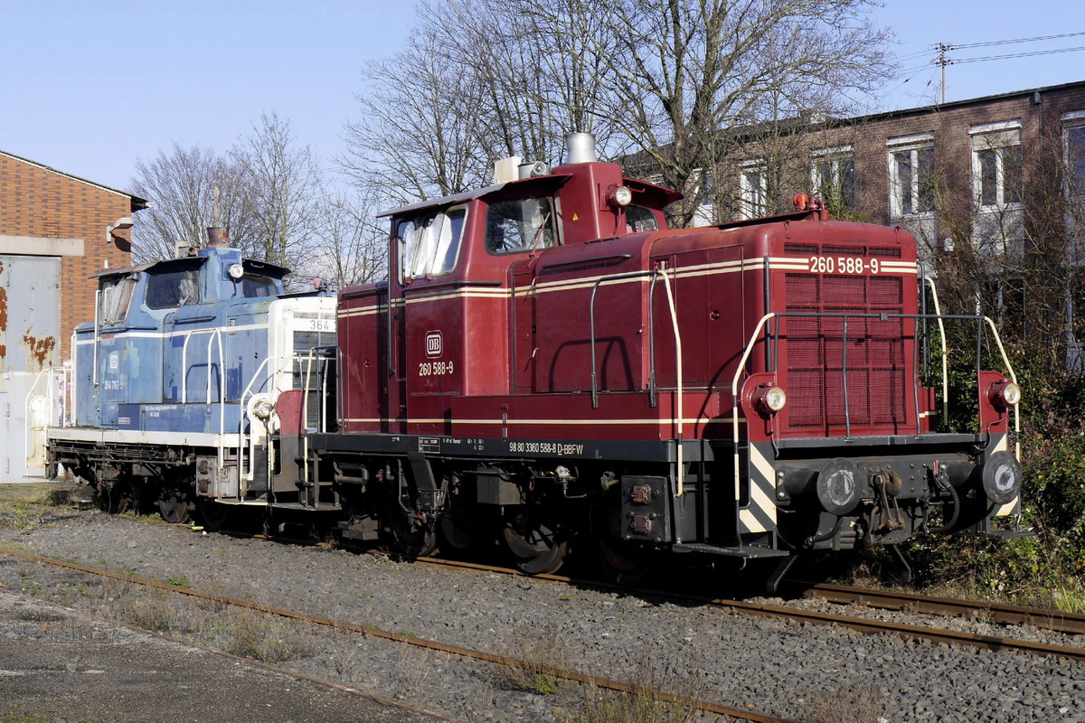 98 80 3 360 588-8 D-BBFW, zurückversetzt in den Zustand als DB-Lok 260 588, abgestellt bei der RSE in Bonn-Beuel. Aufgenommen vom DB-Bahnsteig aus am 29.11.17.