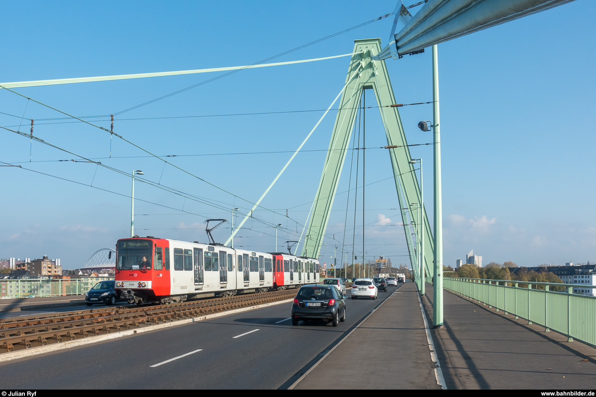 Stadtbahn Köln: Wagen 2192 überquert am 3. November 2017 zusammen mit einem bereits modernisierten Exemplar dieser Baureihe die Severinsbrücke auf der Linie 3 in Richtung Mengenich.