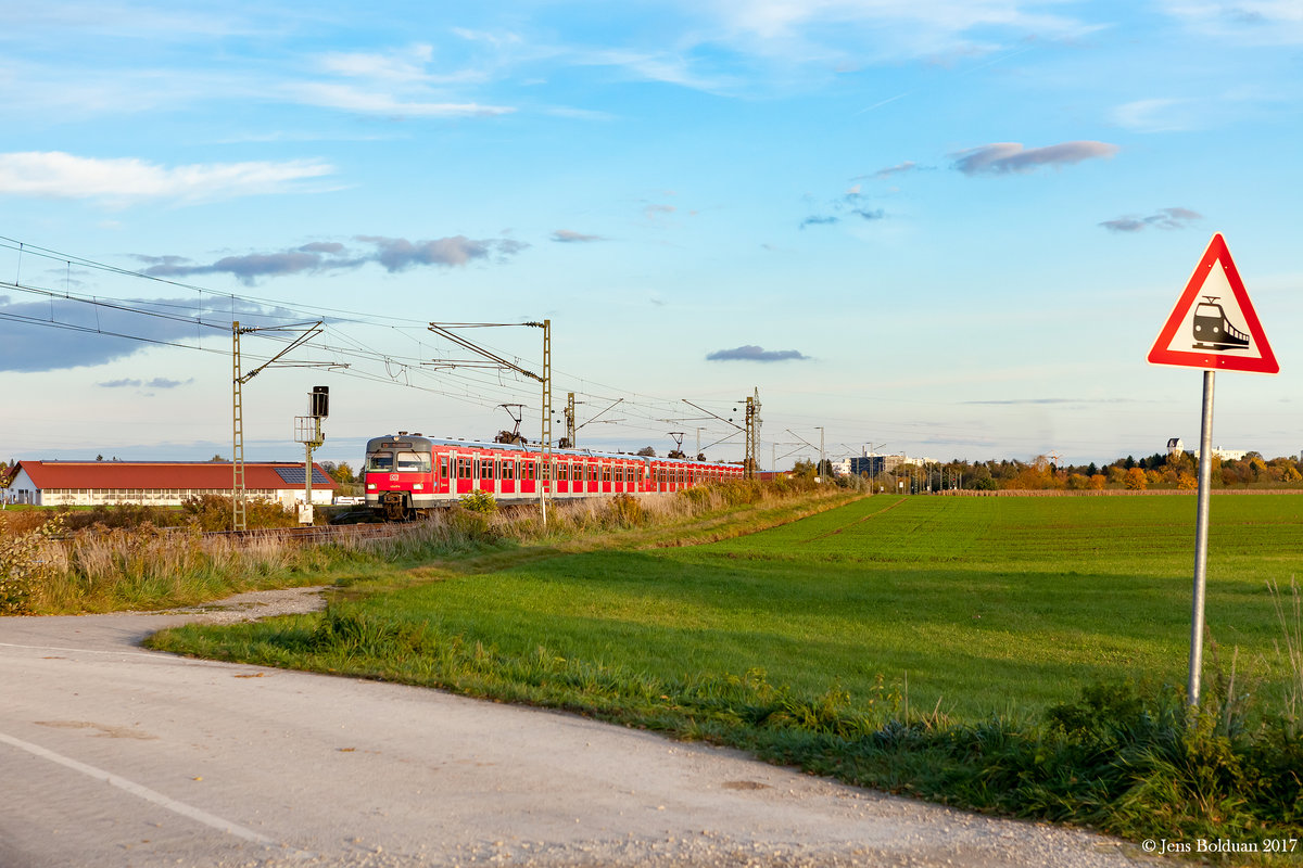 Ein Vollzug der S4 bestehend aus zwei 420er-Einheiten kommt am Abend des 12.10.2017 bei München-Aubing vorbei