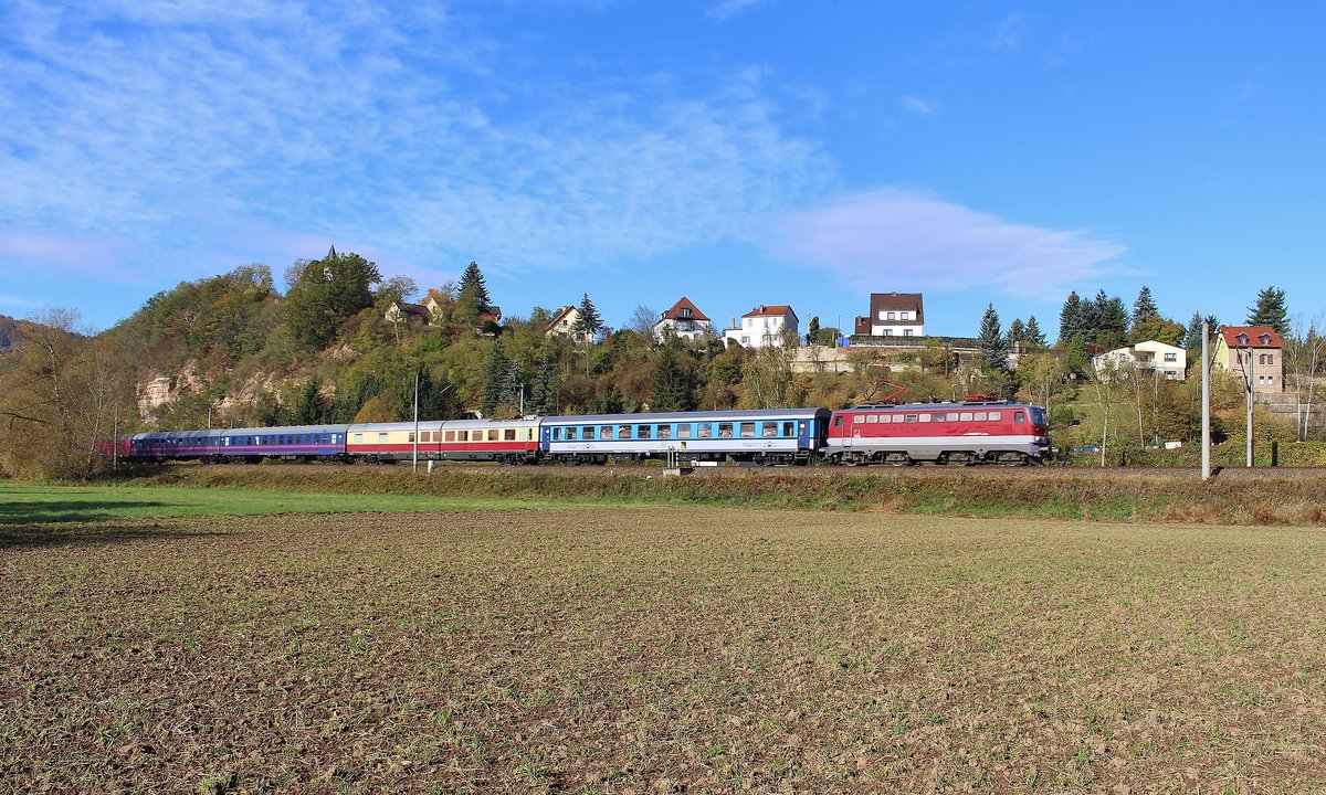 1016 003 fährt mit einem Kesselzug bei Ollersbach in Richtung St. Pölten, aufgenommen am 16. Oktober 2017.