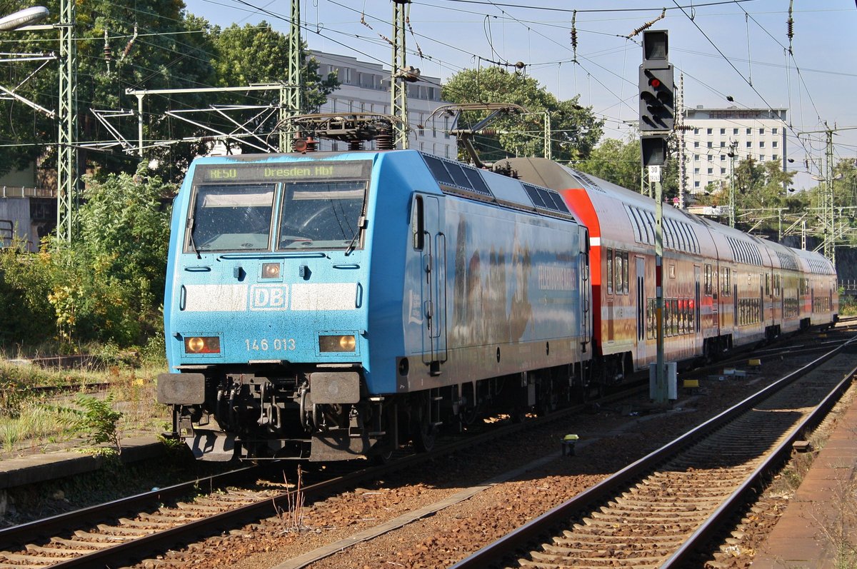 146 013 erreicht am 30.9.2017 mit dem RE50 (RE16513) "Saxonia" von Leipzig Hauptbahnhof den Dresdener Hauptbahnhof.
