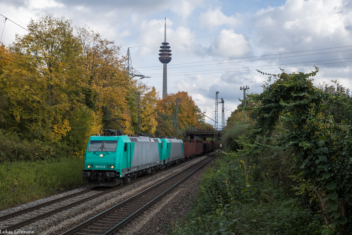 185 575 und 185 xxx mit einem leeren Holzzug passiert die Ansbacher Strecke und setzt seine Reise nach Fürth fort,