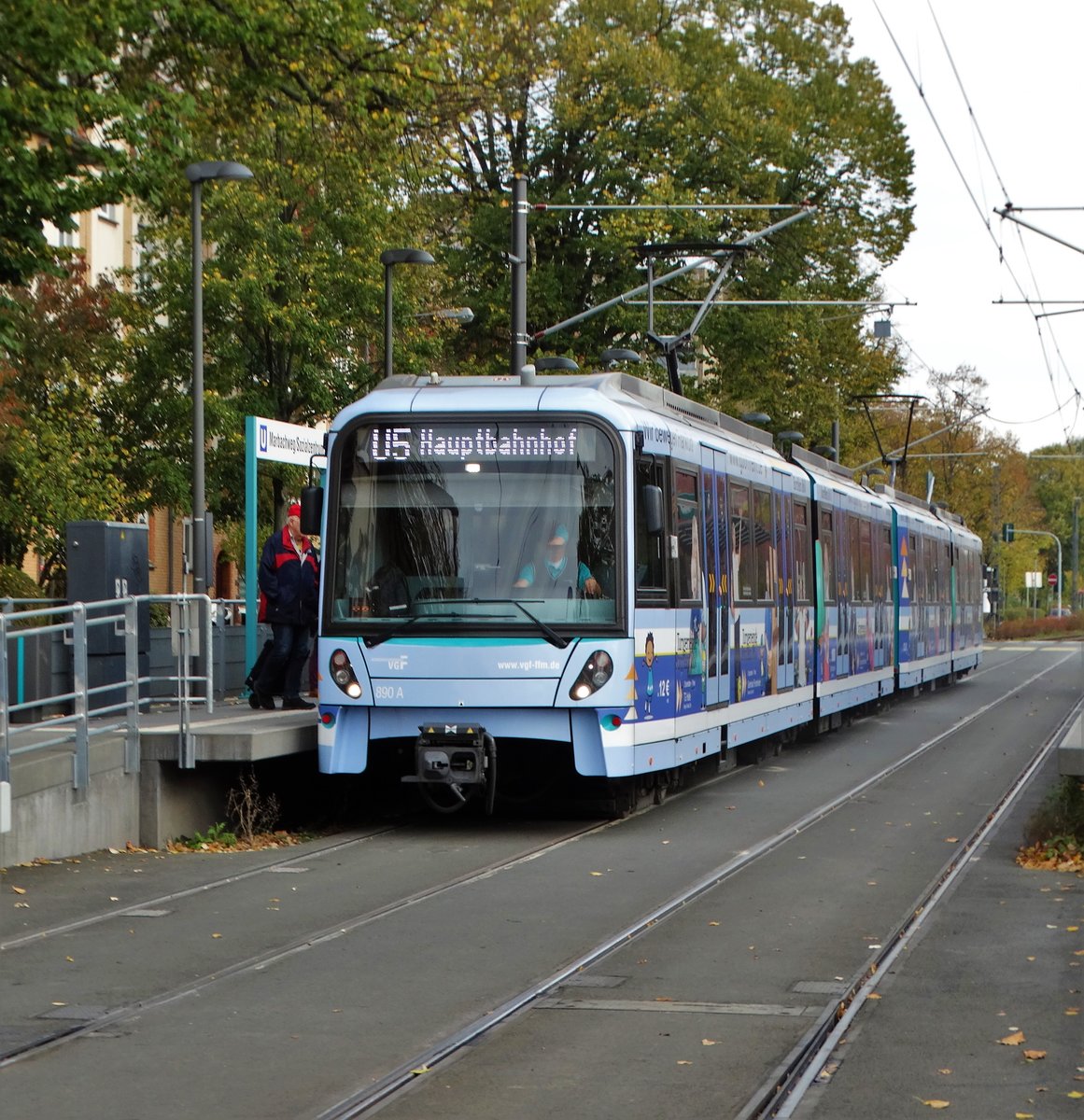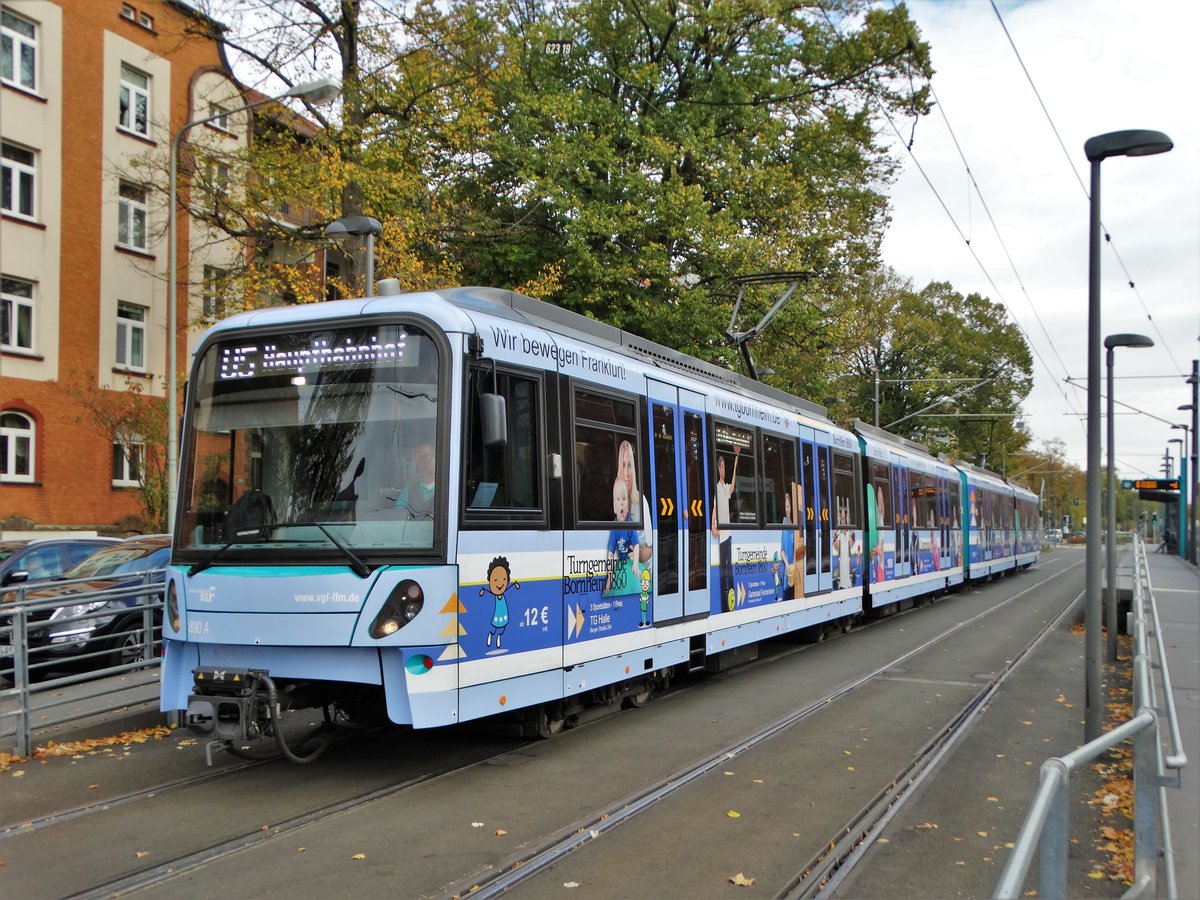 VGF Bombardier U5-50 Wagen 890 Vollwerbung TG Bornheim am 21.10.17 in Frankfurt Eckenheim von einen Gehweg aus fotografiert