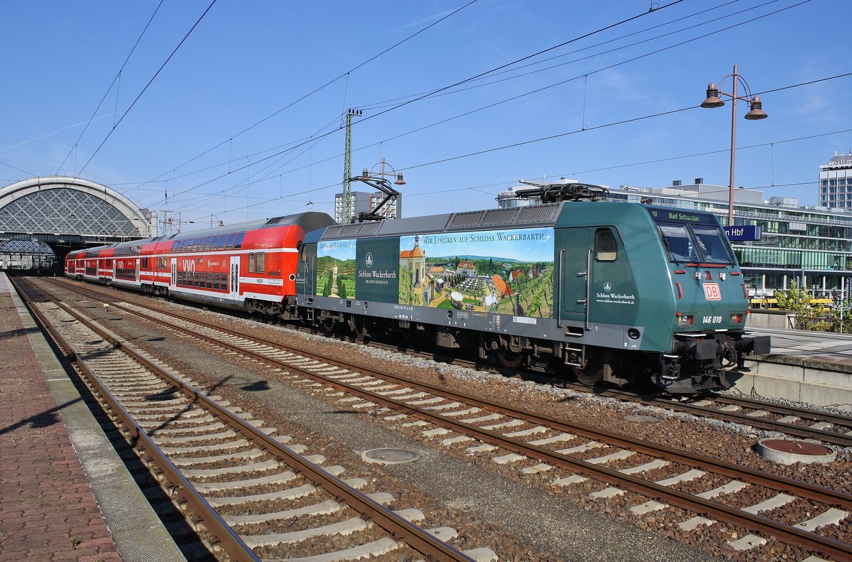 146 010 verlässt am 30.9.2017 mit der S1 von Meißen Triebischtal nach Bad Schandau den Dresdener Hauptbahnhof.