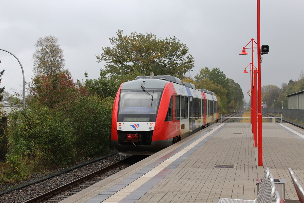 Die Regionalbahn Schleswig-Holstein (RBSH) mit RE 21023 am 24.10.17 im Bahnhof Wrist