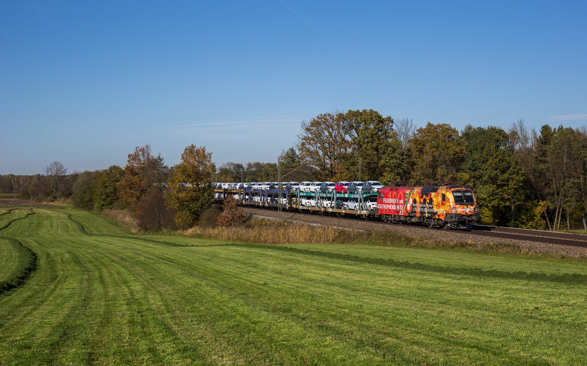 1016 048 "Niederösterreichischer Landesfeuerwehrverband" fährt mit einem Autozug bei Hilperting in Richtung Salzburg, aufgenommen am 19. Oktober 2017.