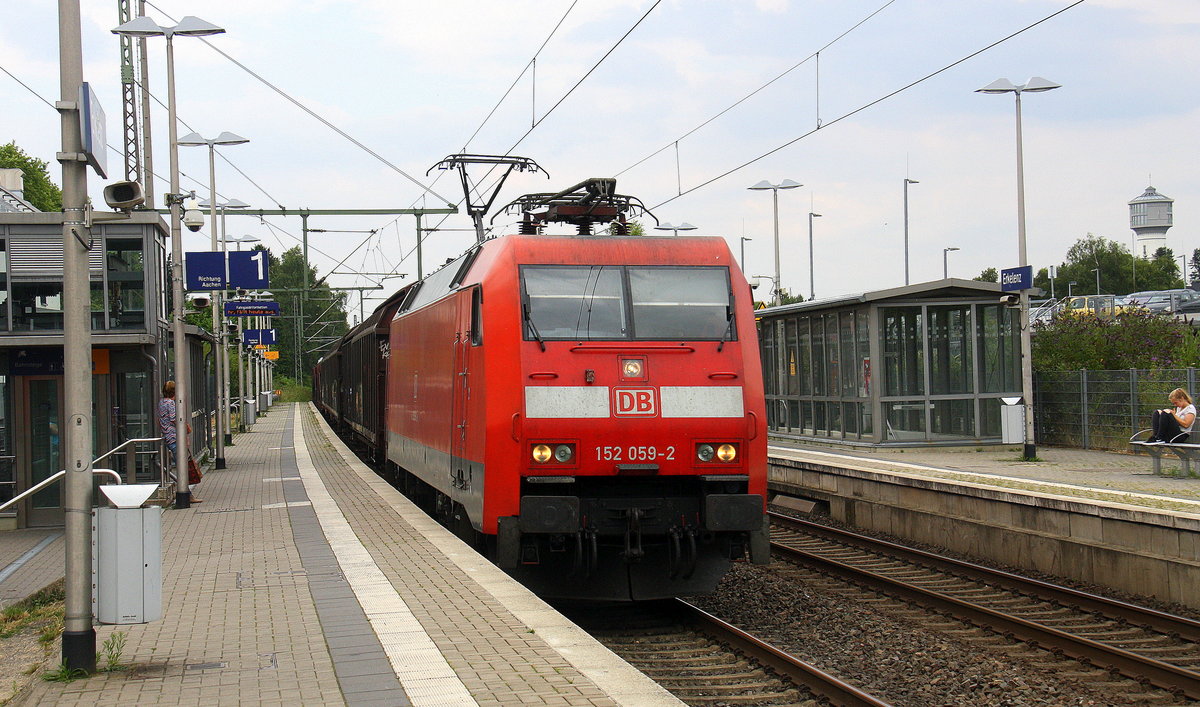 152 059-2 kommt mit einem Audi-VW-Skoda-Zug aus Osnabrück nach Kortenberg-Goederen(B) und kommt aus Richtung Mönchengladbach-Hbf,Rheydt-Hbf,Wickrath,Beckrath,Herrath und fährt durch Erkelenz in Richtung Baal,Hückelhoven-Baal,Brachelen,Lindern,Süggerath,Geilenkirchen,Frelenberg,Zweibrüggen,Übach-Palenberg,Rimburg,Finkenrath,Hofstadt,Herzogenrath, Kohlscheid,Richterich,Laurensberg,Aachen-West.
