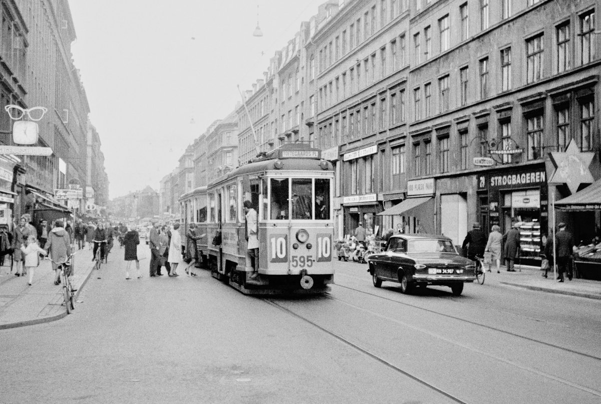 København / Kopenhagen Københavns Sporveje SL 10 (Tw 595 + Bw 15xx) Vesterbro, Istedgade / Saxogade im Oktober 1968. - Scan von einem S/W-Negativ. Film: Ilford HP4.