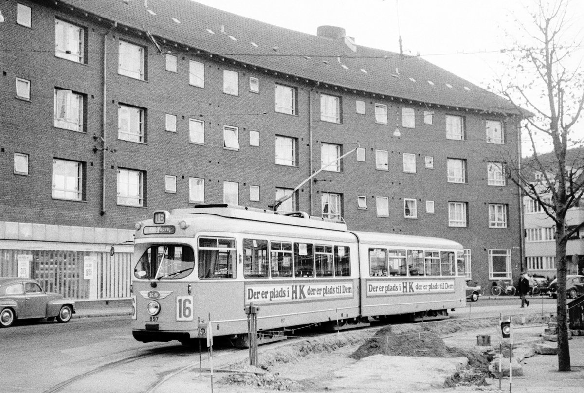 København / Kopenhagen Københavns Sporveje SL 16 (Tw 555 + Bw 15xx) København SV (: Südwest), Kongens Enghave, Mozarts Plads im Oktober 1968. - Scan von einem S/W-Negativ. Film: Ilford HP4.
