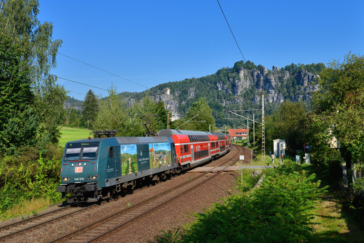 145 058 mit leeren Containerwagen durchfährt den kleinen Ort Mitteldachstetten, 17.8.17