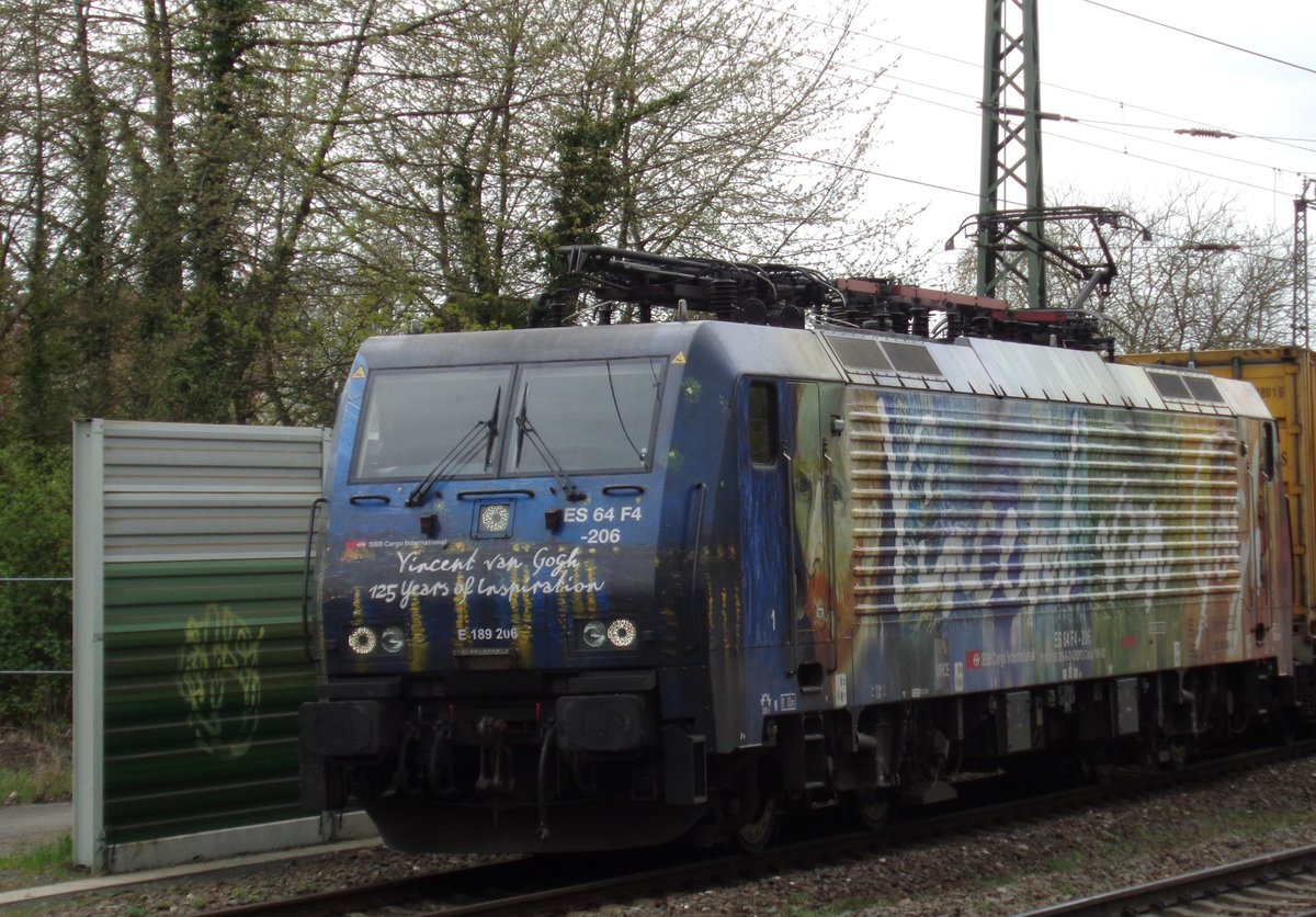 193 301 mit Werbung und Güterzug in Opladen, 13.4.18.