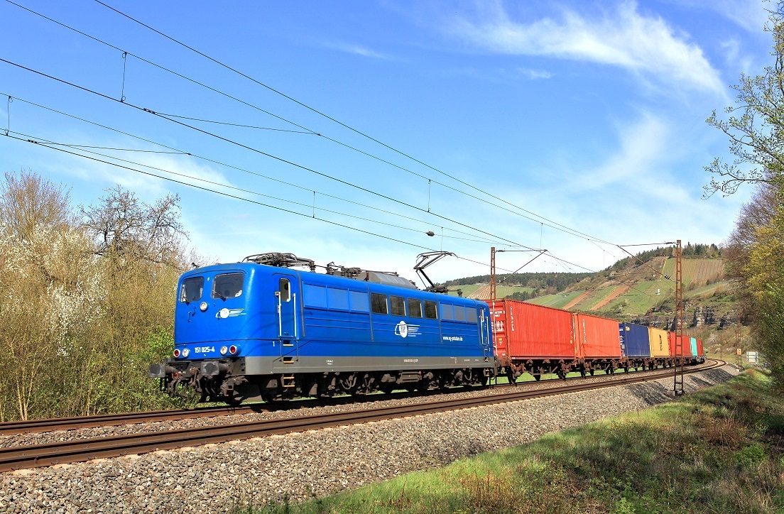 151 058 hat am Vormittag des 7. April 2018 einen Güterzug bis Amstetten (Württ) nachgeschoben und fährt jetzt wieder die Geislinger Steige hinab.
