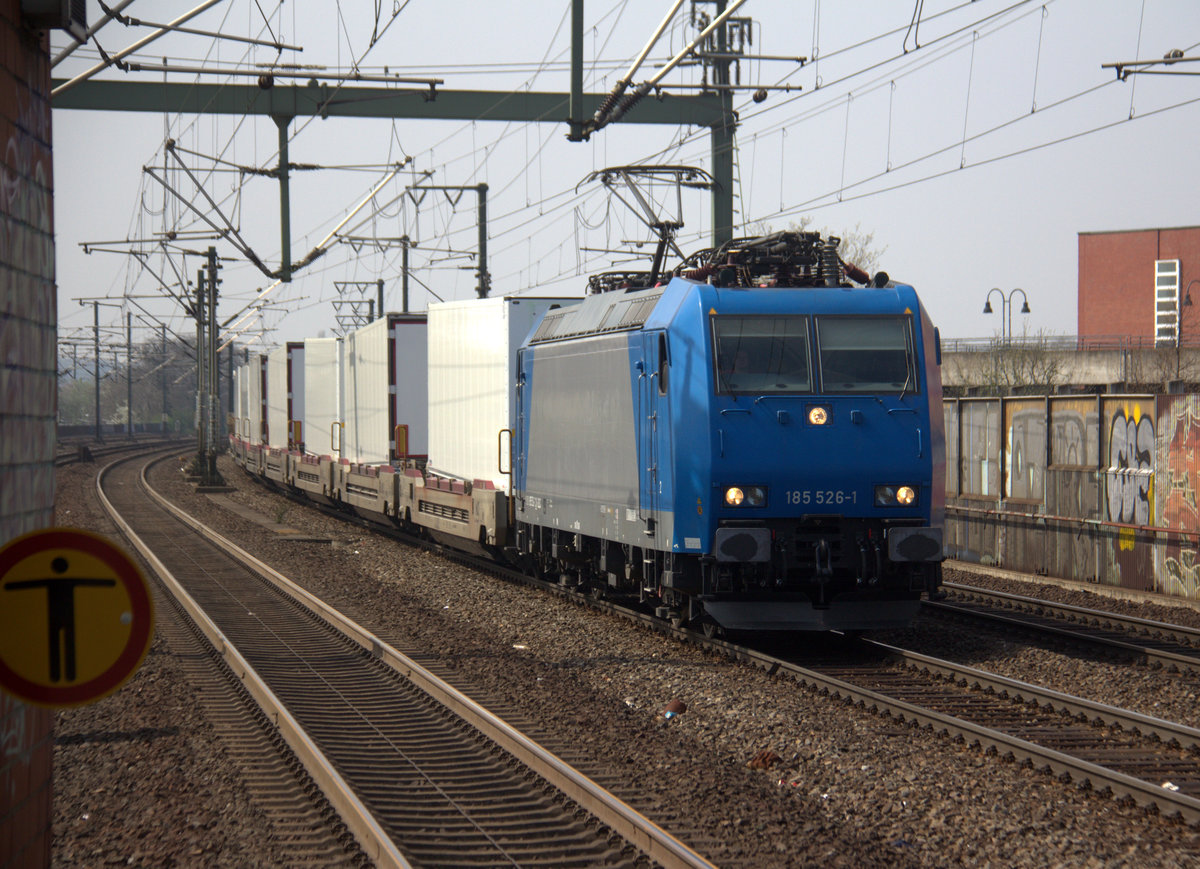 185 526-1 von BLS kommt mit einem LKW-Zug aus Kaldenkirchen(D) nach Domodossola(I) und kommt aus Richtung Mönchengladbach,Rheydt,Jüchen,Grevenbroich und fährt durch Köln-Ehrenfeld und fährt dann weiter in Richtung Köln-West,Köln-Süd. Aufgenommen vom Bahnsteig 3 in Köln-Ehrenfeld. Bei schönem Frühlingswetter am Nachmittag vom 14.4.2018.