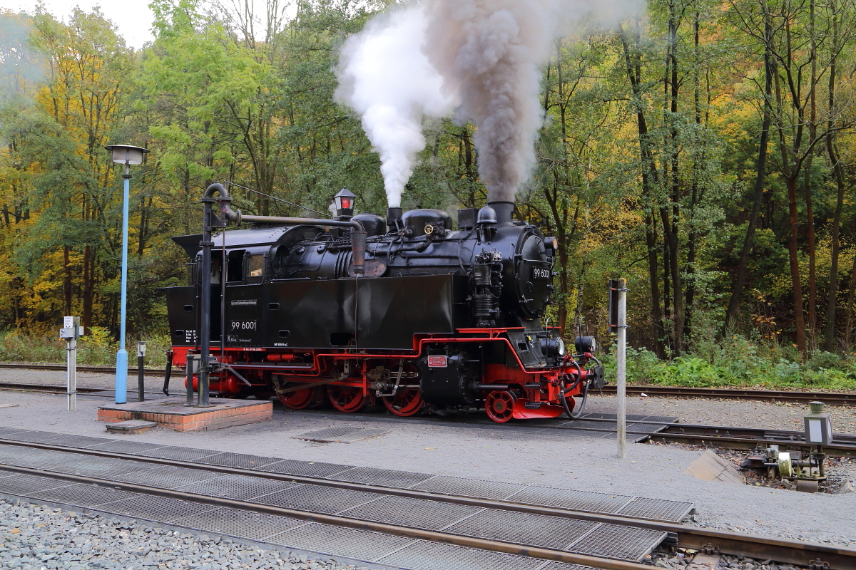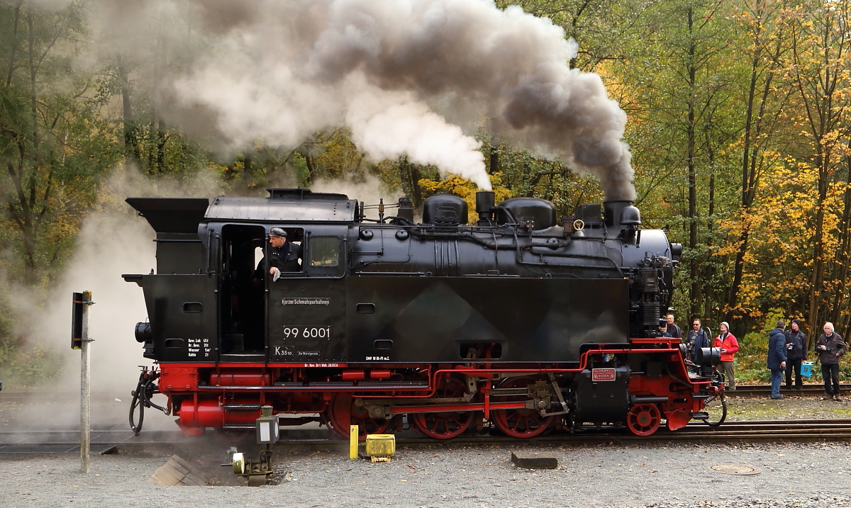 Lokportrait von 99 6001, aufgenommen am 23.10.2016, während einer Sonderzugveranstaltung der IG HSB, im Bahnhof Alexisbad.