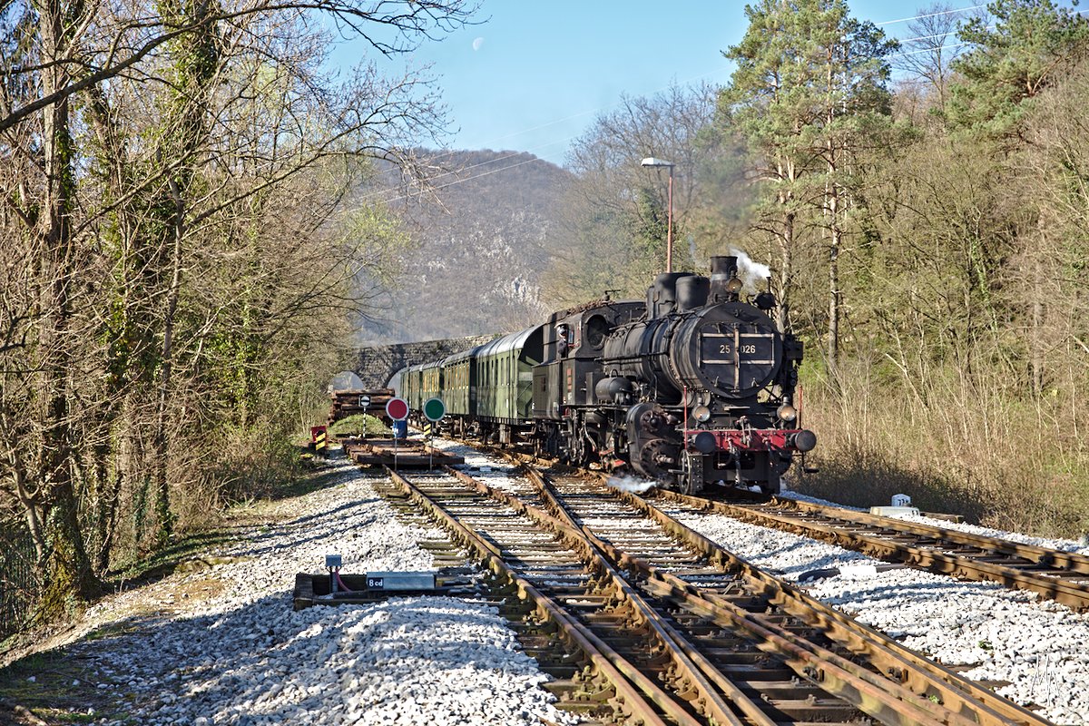 Die 25.026 verlässt gerade mit ihrem ausschließlich für Fotografen in Bewegung gesetzten stilechten Sonderzug diese Haltestelle Podmelec und fällt fährt gleich in einen der zahlreichen Tunnel ein. (06.04.2018)