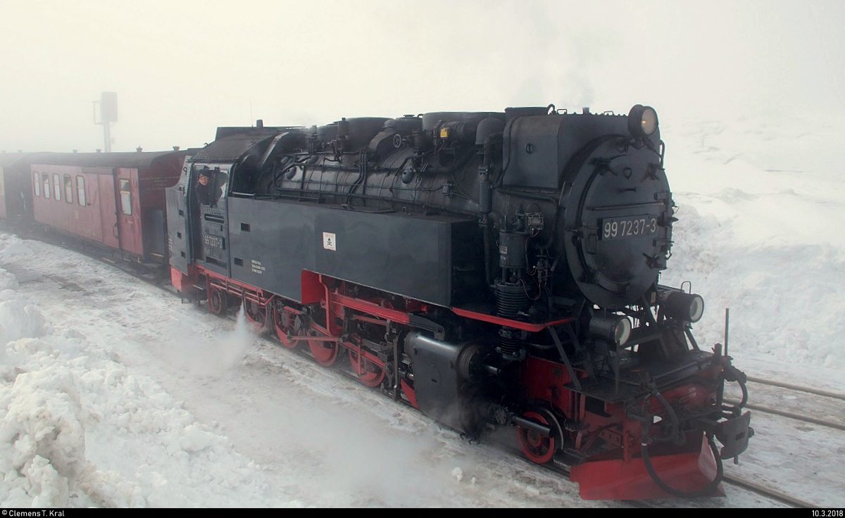 Bei dieser schlechten Sicht muss man sich auf Nase und Ohren verlassen, wenn sich ein Zug nähert. So taucht 99 7237-3 der Harzer Schmalspurbahnen GmbH (HSB) als P 8925 von Wernigerode auf, die ihren Endbahnhof Brocken erreicht. [10.3.2018 | 12:09 Uhr]