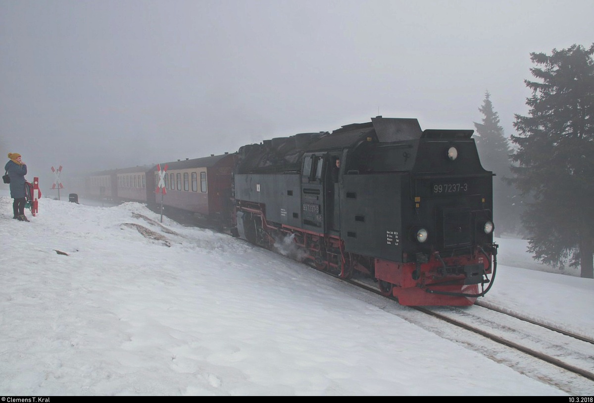 99 7237-3 der Harzer Schmalspurbahnen GmbH (HSB) als P 8926 vom Brocken nach Drei Annen Hohne fährt am Bahnübergang der K1356 auf der Brockenbahn (Bahnstrecke Drei Annen Hohne–Brocken | KBS 325). [10.3.2018 | 12:31 Uhr]