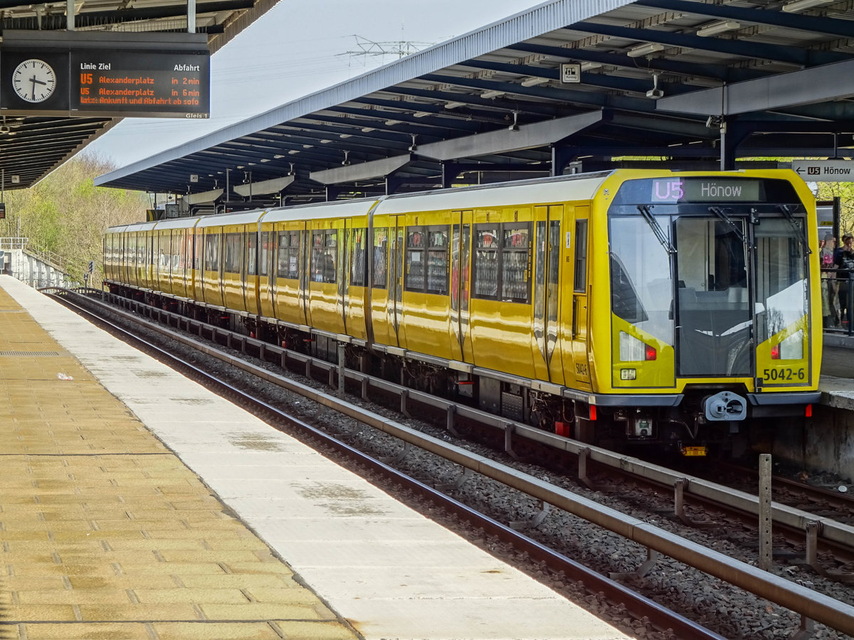 Berliner U-Bahnzug 5042-6 als U5 nach Hönow in Wuhletal, 18.04.2018.