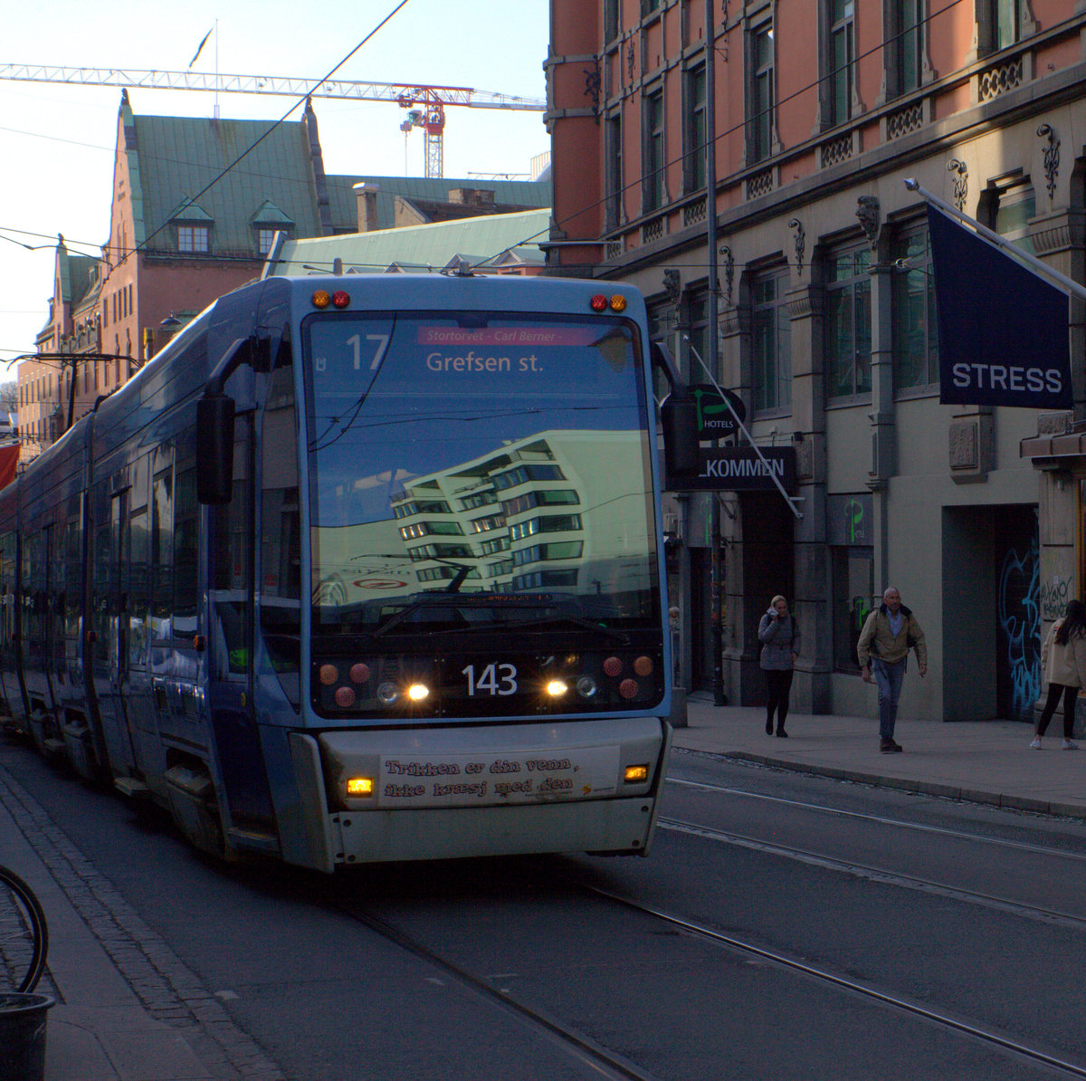 Ein Straßenbahnzug der Linie 17 in Oslo, moderne Architektur im Spiegel.