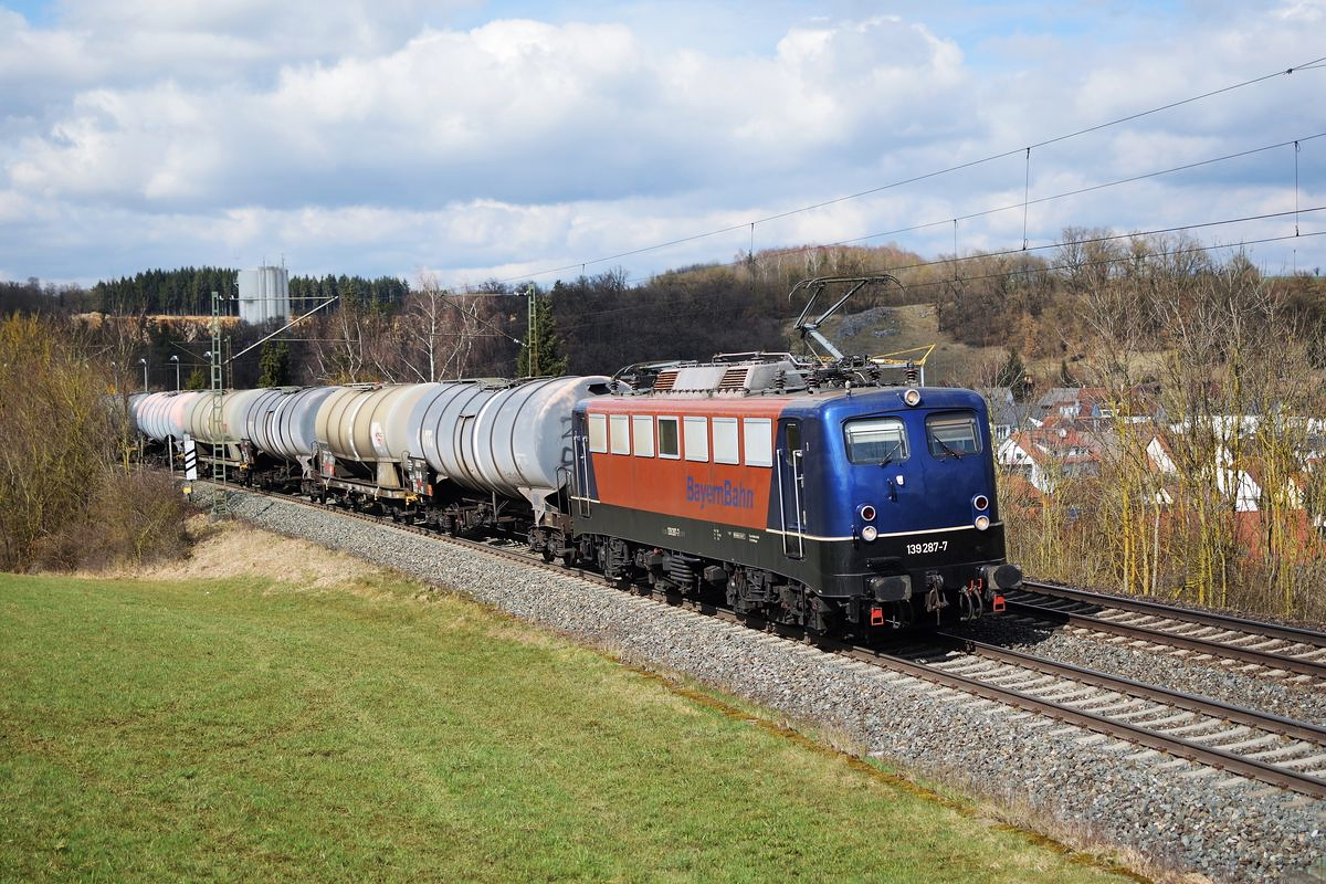 Am 31. März 2018 zieht 139 287 der BayernBahn einen Kesselwagenganzzug durch Westerstetten Richtung Ulm.