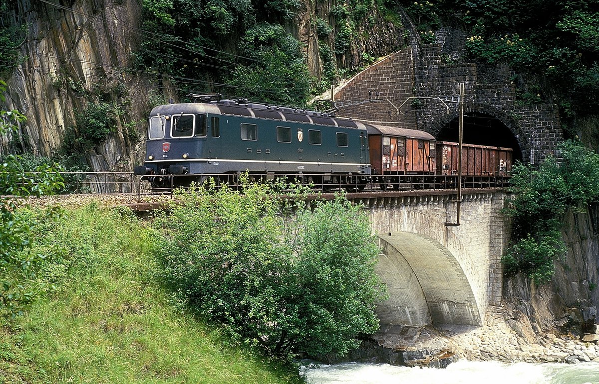 SBB/EBT: Dieser nicht alltägliche Zug der damaligen EBT mit einer nicht erkennbaren SBB Re 4/4 II vor zehn EBT Personenwagen verschiedener Bauart wurde im August 1994 bei Oberburg verewigt.