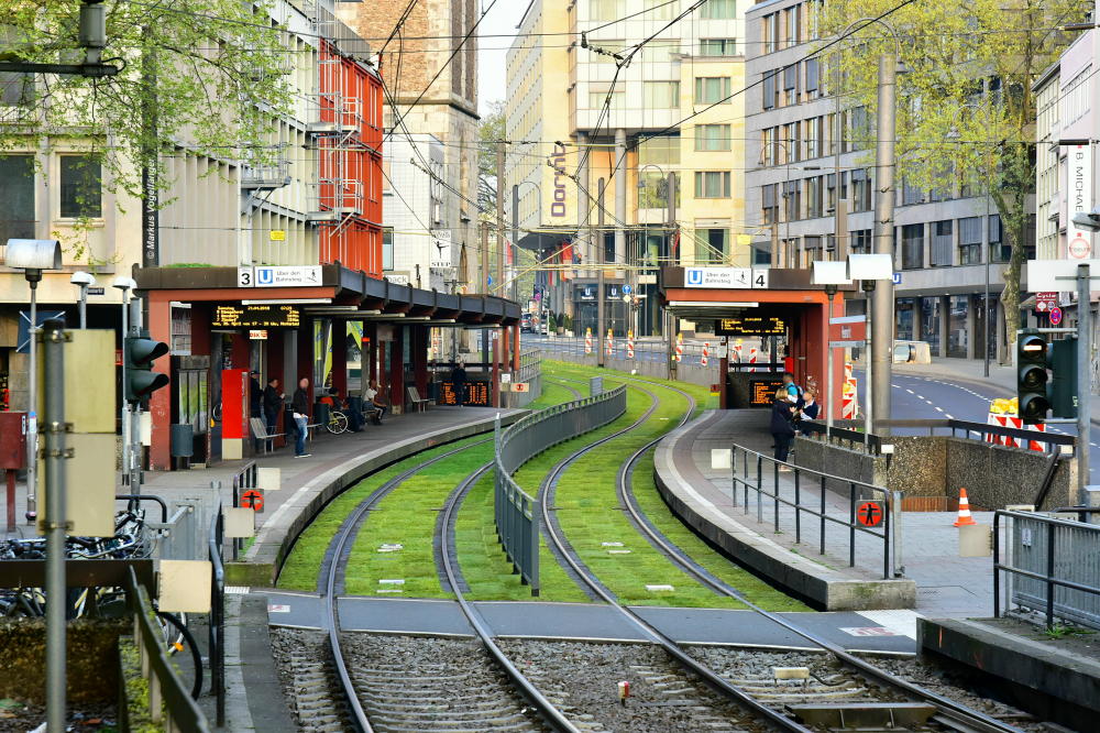 Das Rasengleis auf der Cäcilienstraße/Augustinerstraße, welches zwischen der Nord-Süd-Fahrt und dem Gleiswechsel "Kleine Sandkaul" vor der Haltestelle "Heumarkt" bis jetzt endete, wurde in die Haltestelle Heumarkt hinein, bis zum dortigen Fußgängerüberweg, verlängert.