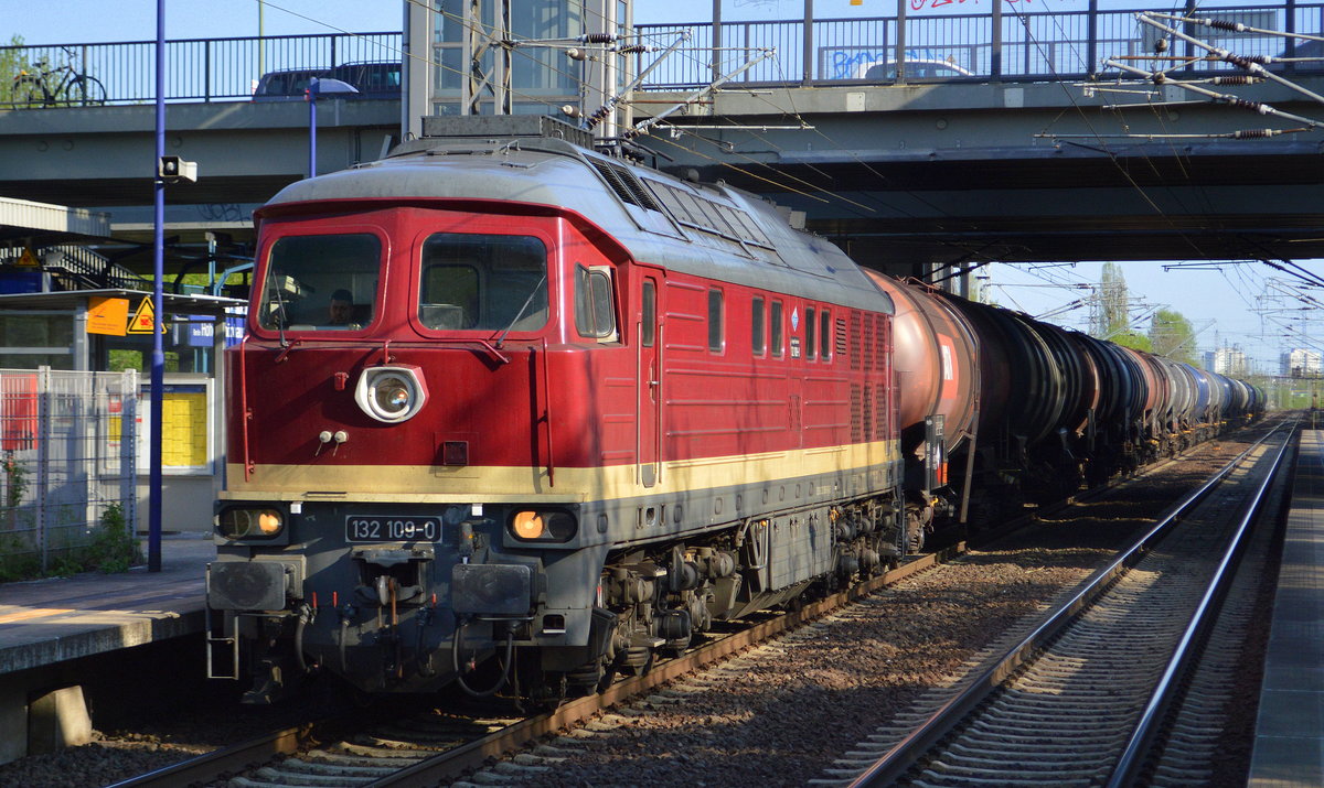 LEG 132 109-0 [NVR-Nummer: 92 80 1232 109-9 D-LEG] mit Kesselwagenzug (leer) Richtung Stendell am 20.04.18 Durchfahrt Bf, Berlin-Hohenschönhausen.